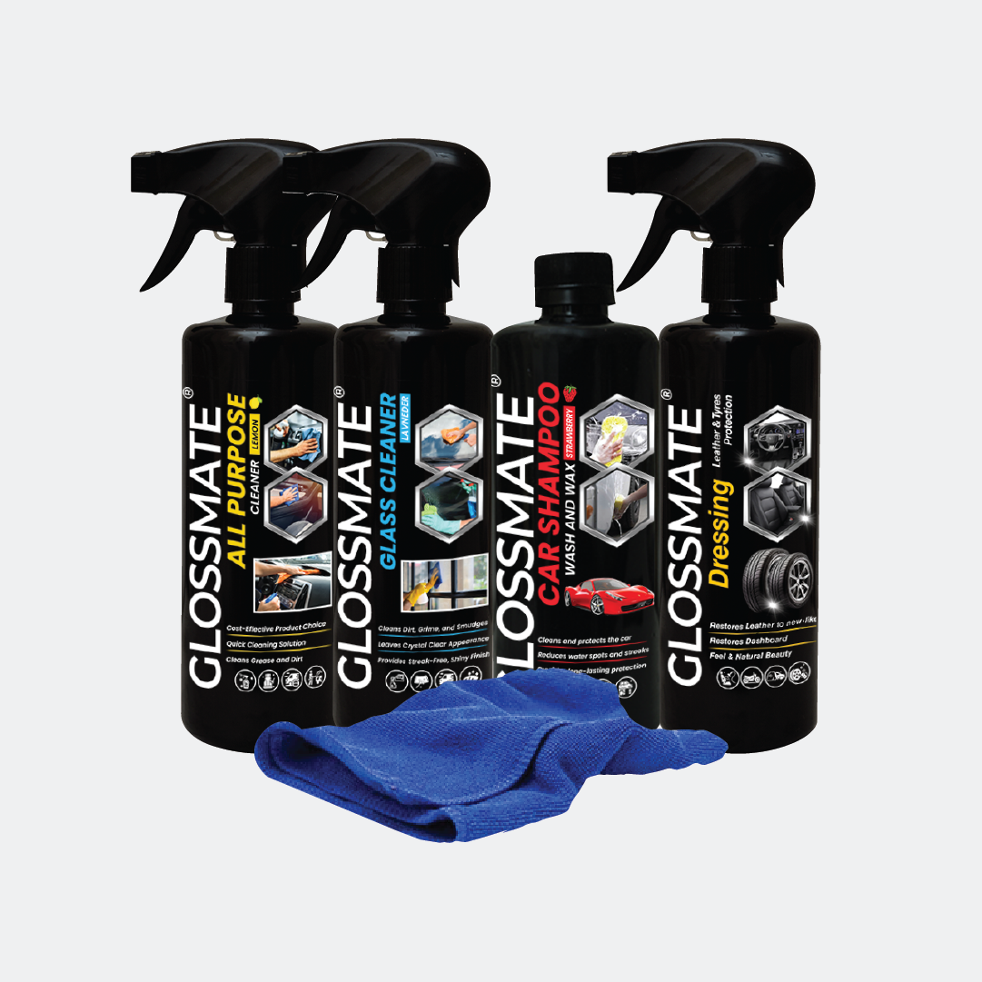 Car Shampoo + Leather & Tyre Dressing + All Purpose Cleaner + Glass Cleaner + Free Single Side Micro Fiber